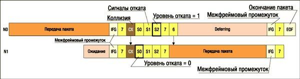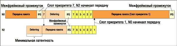 Наряду с механизмом разрешения коллизий HomePNA "расширила" спецификацию IEEE 802.3 оригинальным методом назначения приоритетов трафику. Межфреймовый промежуток, отделяющий кадры HomePNA-Ethernet один от другого, разделили на семь интервалов, отвечающих возможным уровням приоритета (рис.2а). В каждый из этих интервалов может "заговорить" только то устройство, чей трафик имеет соответствующий приоритет. Таким образом, коллизии возникают только между пакетами одинакового приоритета, при этом соблюдается строгая очередность обращения к среде передачи - сначала идет трафик 7-го уровня, потом 6-го и т. д.