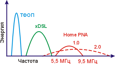 В роли топологии была избрана схема "звезда" со стандартной длиной сегмента 150 м, что вполне логично, так как каждая квартира или офис, как правило, имеют отдельную телефонную линию. А в общей распределительной коробке можно поставить коммутатор сопряжения LAN/WAN, и здесь важную роль сыграла изначальная ориентация на совместимость с сетями Ethernet.