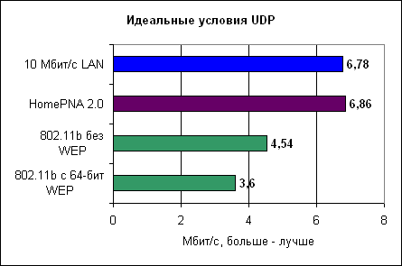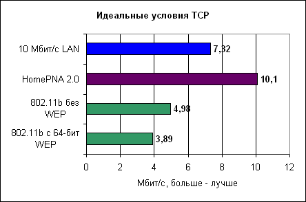Сравнительные тесты сетей HomePNA, Ethernet 10Мбит/сек и WiFi показывают, что при идеальных условиях наибольшую скорость передачи данных показывает первая (см. рис.6,7)