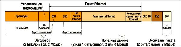 Фактически в основе протокола HomePNA лежат инкапсулированные фреймы Ethernet. Впрочем, и здесь не обошлось без усовершенствований. Первые 120 бит пакета (как показано на рисунке) всегда передаются на скорости 2 Mbaud (2 бита на символ), что соответствует нижней границе производительности сети. Это дает гарантию правильной интерпретации всех значимых заголовков пакета любым устройством при наиболее неблагоприятной (в определенных пределах, конечно) шумовой обстановке в кабельной системе. Для остальной части пакета используются текущие установки скорости передачи. Изначально все соединения инициируются с минимальными параметрами, затем стек протоколов анализирует количество ошибок в пакетах и принимает решение о том, следует ли перейти на более высокий уровень производительности или нет. О параметрах соединения устройства договариваются с помощью пакетов-запросов RRCF (Rate Request Control Frame).