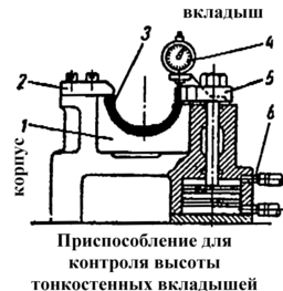 сновное условие – плотное прилегание в гнезде корпуса, что достигается пригонкой вкладышей по краске. После пригонки вкладыша – пришабривают внутреннюю поверхность вкладыша к валу, добиваясь контакта 75...85% (на 1 см2 – min 3 пятна). Контроль смонтированного вала -прокручиванием вручную (ослаблением или затяжкой гаек). Радиальный зазор проверяют прокручиванием вала со стальными пластинками (рад0,05...0,12мм). Тонкостенные вкладыши (S/D = 0,025...0,045); S = 1...2,5мм.; устанавливаются с буртиками, усами, углублениями. Гнезда под вкладыши обрабатываются по IT6 с конусностью и овальностью 0,01...0,015мм на 100мм. Пригонку вкладышей к гнездам не производят. Сами вкладыши проверяют на прилегание по краске специальным приспособлением под постоянной нагрузкой. При этом добиваются 85% контакта.