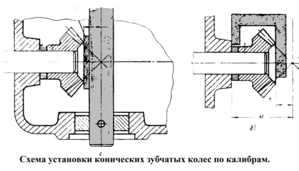 ри сборе конических колес требуемый зазор обеспечивается путем регулирования зацепления прокладками. Регулирование может быть упрощено, если одно из колес устанавливать по калибрам: