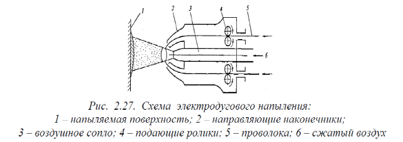 воздух. Струя сжатого воздуха отрывает с проволок-электродов частицы расплавленного металла и уносит их к напыляемой поверхности.