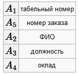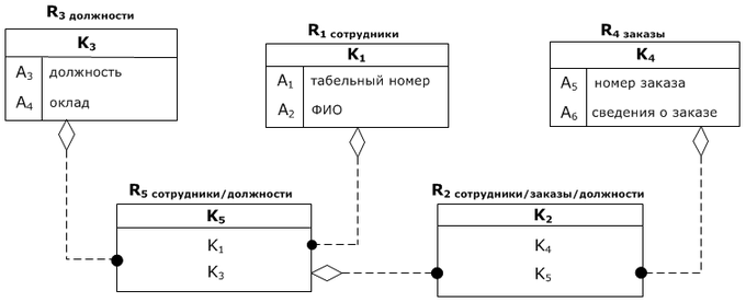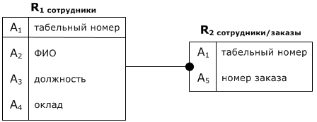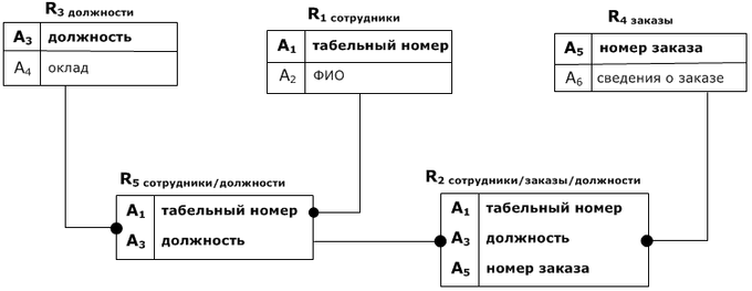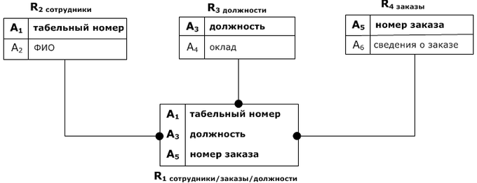 U = (табельный номер, ФИО, должность, оклад, номер заказа, сведения о заказе) = (A1,A2,A3,A4,A5,A6)