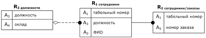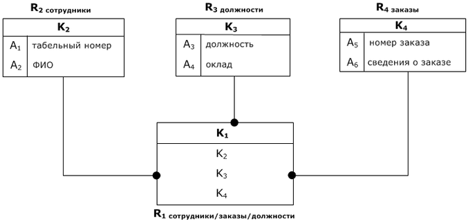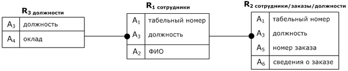 Предположим, вдруг оказалось, что сотрудник может занимать несколько должностей, и ещё теперь в таблице надо хранить сведения о заказе. В этом случае схема преобразуется к следующему виду: