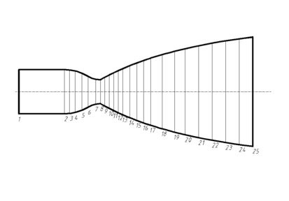 Вычерчивается в масштабе геометрические внутренние обводы камеры сгорания и сопла, после чего камера разбивается сечениями на ряд участков. В этом случае было проведено разбиение на 24 участка.