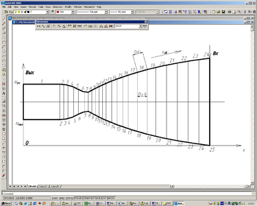 Вычерчивается в масштабе геометрические внутренние обводы камеры сгорания и сопла, после чего камера разбивается сечениями на ряд участков. В этом случае было проведено разбиение на 24 участка.