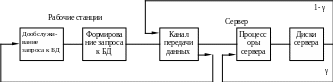 На рабочей станции сети формируется запрос пользователя к базе данных, расположенной на сервере. Этот запрос через канал передачи данных поступает на обработку в процессор сервера, а затем в дисковую подсистему. После этого запрос с вероятностью