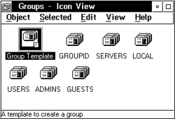 В ней имеется шаблон для создания групп пользователей "Group Template" и несколько пиктограмм, соответствующих созданным автоматически при установке сервера группам пользователей.