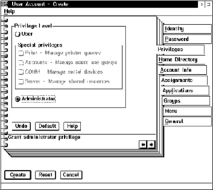 Пользователи делятся на обычных и администраторов сети. Обычные пользователи могут иметь дополнительные полномочия, такие как управление очередями печати, создание других пользователей и групп пользователей, управление последовательными устройствами и другими ресурсами коллективного доступа. Администратор сети имеет, разумеется, все возможные права и полномочия.