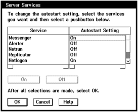 12. Вы окажитесь в диалоговой панели "Server Services", в которой перечислены различные системы сервера IBM LAN Server 4.0 Advanced