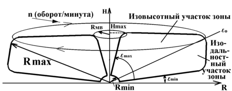 Форму зоны обзора РЛС в угломестной плоскости (Рис.1.4) принято характеризовать графиком зависимости R=f(H), где R – расстояние до границы зона обзора; H - высота полёта цели над поверхностью земли, а также размерами зоны в азимутальной плоскости.