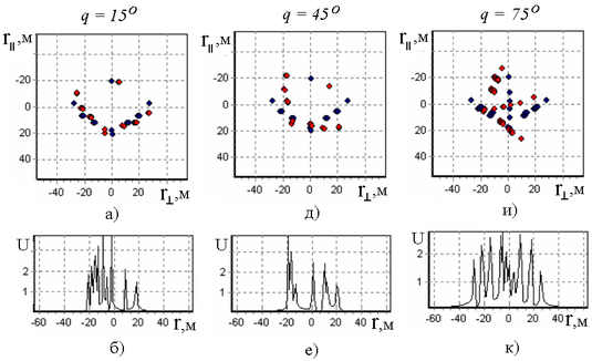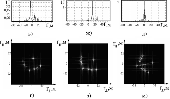 На рис. 5 приведены исходные и соответствующие выбранному ракурсу расположения рассеивающих центров (РЦ) поверхности цели типа В-52 на ракурсах 15˚, 45˚, 75˚ (рис. 5, а, д, и), ДП и АП (рис. 5, б, в, е, ж, к, л), а также полученные ДРЛИ. Из рис. 5, г, з, м видно, что все полученные на разных ракурсах ДРЛИ соответствуют реальным положениям РЦ (рис. 5, а, д, и). Также видно, что ДП и АП (рис. 5, б, в, е, ж, к, л) достоверно отражают радиальные (порядка 45 м) и поперечные (около 57 м) размеры цели.
