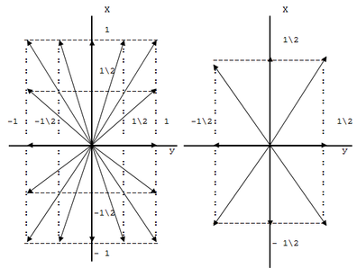 Для простоты представления градаций по углу, сегменты на рисунке показаны в виде векторов, исходящих из начала координат, при этом проекции вектора на оси координат имеют два значения длины: 1 или 0,5. То есть имеется 24 разновидности сегментов - 16 единичной длины и 8 половинной, из которых может быть построен знак.