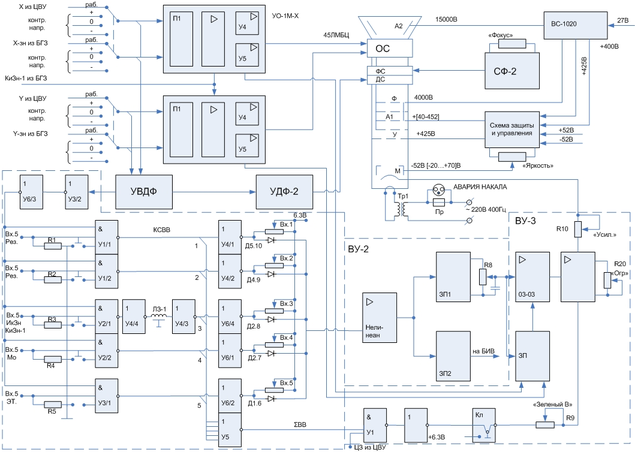 От УФОИ напряжения Uх и Uy поступают через схему контроля УО в усилители отклонения. Схема контроля УО обеспечивает подачу на усилители отклонения либо координатных напряжений от УФОИ, либо эталонных напряжений для проверки исправности усилителей. В усилителях отклонения УО-1М обеспечивается сложения напряжений Ux и Uy с напряжением коррекции центpa отображаемой информации отдельно по координате Х и Y, при этом знаковое напряжение отсутствует (нет КИЗН от БГЗ). Затем эти напряжения усиливаются парафазными усилителями и преобразуются в токи, протекающие через катушки отклоняющей системы. Усилители отклонения обеспечивают отдельную регулировку амплитуды напряжений отклонения (К) и центра отображаемой информации (О). Под действием токов, протекающих в катушках отклоняющей системы, происходит суммирование магнитных полей и электронный луч отклоняется в требуемое место экрана ЭЛТ.