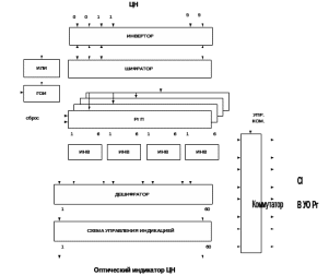 Одновременно с регистров памяти информация поступает на дешифратор для преобразования двоичного кода цифр в позиционный и далее на схему управления сегментными индикаторами. Это обратное преобразование необходимо для последовательной индикации процесса набора цифр на оптических ячейках. Для обеспечения нормальной работы дешифратора используется парафазный код, который формируется с помощью инверторов.