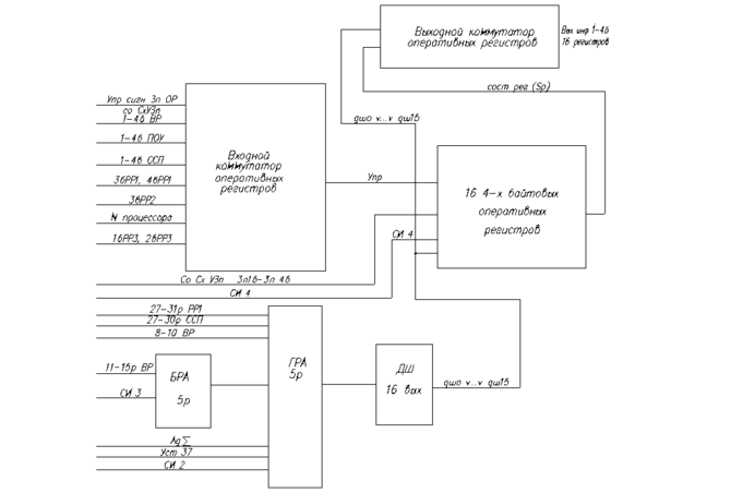 Выходной коммутатор представляет собой четыре однобайтовые сборки (ИЛИ), на которые поступает информация с 1 по 4-й байт 16-ти регистров. Подключение информации через коммутатор осуществляется сигналами, вырабатываемыми дешифратором адреса ОР (Дш 16 вых), который работает от главного регистра адреса (ГРА).