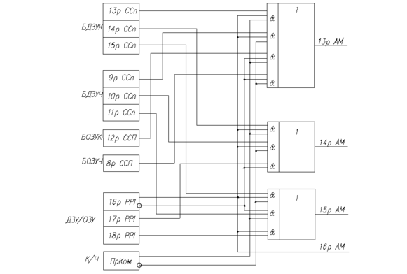 В качестве сигналов, управляющих получением АМ, используется информация в 16-м разряде РР1, указывающая тип обращения («0» — к ОЗУ, «1» — к ДЗУ), и сигнал Пр КОМ (Пр обращения за командой): 0 за числом («0» — обращение за числом, «1» — за командой). Схема работает только в том случае, если 7-й разряд регистра ССП (признак авторазрыва) равен нулю. В противном случае базы в формировании адреса блока ЗУ не участвуют и считаются равными нулю.