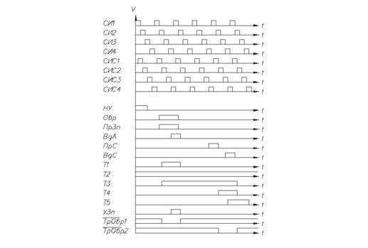 Сигнал с выхода Т5 по следующему СИС1 сбрасывает Т4 в «нулевое» состояние, сигнал ТрОбр2 становиться равным единице, тем самым предотвращает повторное обращение к ЗУ.