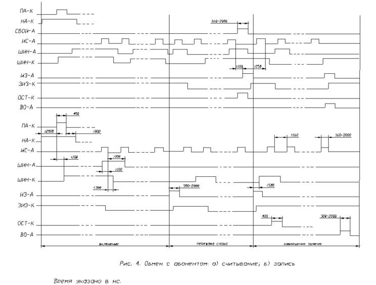 Интервал между соседними сигналами ИС – А должен быть не меньше 160 нс между задним фронтом ИС – А и передним фронтом очередного ИЗ – А, при считывании информации из абонента – не меньше 100 нс, между передним фронтом ИЗ – А и задним фронтом очередного ИС – А при считывании – не менее 150 нс.