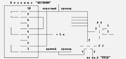 Через нормально замкнутые контакты реле Р9 потенциал цепи обратного провода подан на переключатели клавиш ТР, ОСТ, ЗАП ОР, ЗАП ССП, а также на одну из пар контактов переключателя клавиши ПУСК.