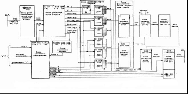 Взаимодействие устройств блока ДЗУ рассмотрим на примере считывания очередной команды процессором ВЧУ. В ходе работы процессор ВЧУ считывает и исполняет команды рабочей (иди тестовой) программы. В очередном цикле обращения ВЧУ выдаёт служебные сигналы на УК и в магистраль адреса. В свою очередь УК запускает в работу блок ДЗУ (включает его в режим чтения) сигналом ОБР. 1 -8 (обращение 1, т.е. для чтения, к модулю памяти № 8, т.е. к ДЗУ). Этот сигнал поступает на блок местного управления, который, в свою очередь, выдает сигнал ЗП на блок регистра кода адреса. В это время ВЧУ выдает в МА код адреса ячейки, который через Блок усилителей-согласователей записывается в Блок регистра кода адреса. Блок контроля адреса производит побайтную поверку принятого кода по модулю 2 (на нечётность). Если ошибок не обнаружено, то Блок местного управления формирует сигналы: ОПРОС Х и ОПРОС У, поступающие на Блок дешифраторов адреса. В блоке ДЗУ начинается выборка числа из ячейки. На это время Блок местного управления выдаёт сигнал ЗАНЯТО через магистральные усилители на блок УК. По этим сигналам Блок дешифраторов адреса преобразует двоичный код адреса ячейка в позиционные коды: ДШ 1 формирует номер кассеты П, в которой находится необходимая ячейка, ДШ2 формирует позиционный код для формирователей втекающего тока (выбирает один из формирователей); ДШЗ формирует позиционный код для формирователей вытекающего тока (выбирает один из формирователей). Под действием выходных сигналов Блока дешифраторов адреса в Блоке формирователей адресных токов выбирается один из 64 формирователей адресных втекающих токов и выбирается один из 128 формирователей адресных вытекающих токов. Выбранные формирователи обеспечивают протекание тока считывания через конкретную ячейку памяти в Блоке памяти. В 36-ти биаксах данной ячейки появляются наведенные токи чтения. Они поступают одновременно на Блок усилителей считывания, где преобразуются из парафазного к однополярному виду и усиливаются до необходимой величины. Далее этот параллельный код числа поступает на вход Блока регистра кода числа. Блок местного управления сигналом СТРОБ РГЧ разрешает запись считанного числа. Если номер кассеты, из которой считано число, совпадает с номером полученным от ДШ1 Блока дешифраторов адреса, то по сигналу СТРОБ РГЧ считанное число записывается в Блок регистра кода числа. Затем Блок местного управления выдаёт сигналы: на блок УК – ГОТОВ, на Блок усилителей-передатчиков – СТРОБ Ч. По сигналу СТРОБ Ч считанное слово информации параллельным 36-ти разрядным кодом передается из Блока регистра кода числа в магистраль чтения. Блок местного управления снимает сигнал ЗАНЯТО с блока УК. На этом завершается процесс считывания очередного слова информации из ячейки блока ДЗУ.