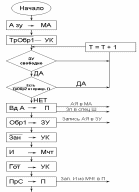| Режим записи можно разделить на две фазы. В первой фазе информация считывается из ЗУ, как и в режиме “Чтение”. Отличие от режима “Чтение” состоит в том, что одновременно с выдачей в МА адреса ячейки памяти, процессор выдаёт по специальной шине признак записи (ПрЗп), а в ЗУ момент снятия сигнала ЗАН отсчитывается не от сигнала Обр1, а от сигнала Обр2. После получения информации из МЧт по сигналу ПрС и обработки её процессор по КШУ 1 выдаёт в УК сигнал Тр Обр 2. | |