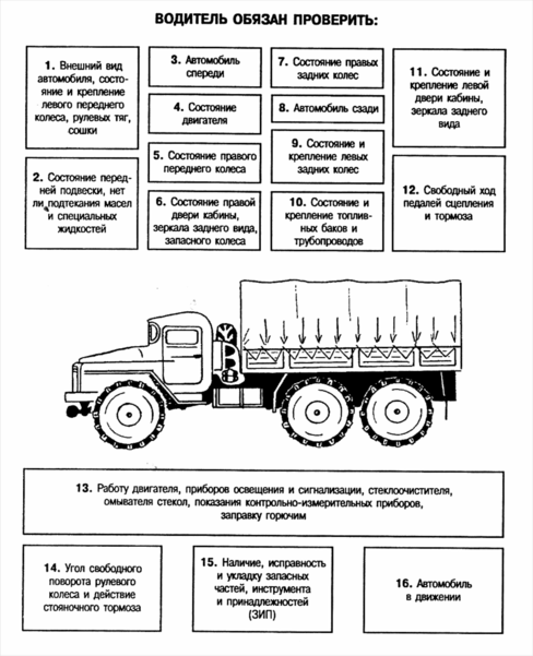 По окончании осмотра водитель (механик-водитель) докладывает командиру (технику) о результатах осмотра и о готовности продолжать движение.