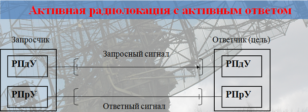 Активная радиолокация с активным ответом — на объекте предполагается наличие радиопередатчика (ответчика), который излучает радиоволны в ответ на принятый сигнал. Активный ответ применяется для опознавания объектов (свой-чужой), дистанционного управления, а также для получения от них дополнительной информации (например, количество топлива, тип объекта и т. д.).