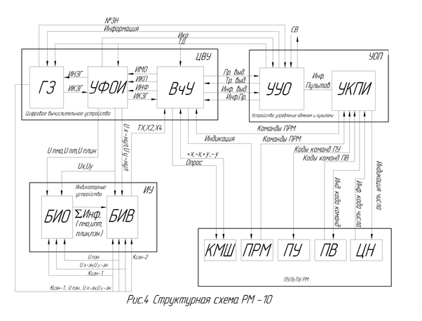 Команда, выдаваемая с АРМ, набирается на пультовой аппаратуре. Информация команды поступает в узел кодирования пультовой аппаратуры (УКПИ) блока УОП, где она преобразуется и готовится к выдаче в составе кодограммы. После нажатия клавиши «ВВОД» ВчУ блока ЦВУ формирует требование выдачи (ТР ВЫД) поступающий на УУО. УУО выдает сигнал требования (ТРБ) на СВ. В СВ запускается программа обмена в режиме приема информации от АРМ. После этого УУО выдает сигнал разрешения выдачи (Р.ВЫД) на ВчУ. По этому сигналу в ВчУ включается программа выдачи информации П2. При этом ВчУ формирует в УУО кодограмму типа КТ-ОП. Для этого в УУО пересылаются координаты маркера по шине ИНФ.ВЫД и коды нажатых клавиш на ПВ и ЦН. Затем ВУ снимает сигнал ТРВЫД с УОП по которому в УКПИ сбрасывается закодированная информация, а УУО выдает кодограмму в СВ.
