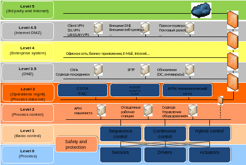 Доступ из офисной сети в технологическую сеть возможен только через сервера-посредники (такие как Citrix и FTP).