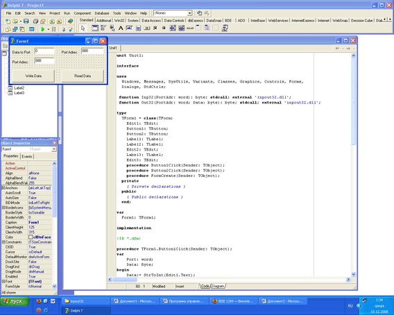 Нам хотелось бы иметь возможность указать адрес порта с которым будем работать, значение которое мы захотим туда (в порт) записать и две кнопки: одна предназначена для записи данных в порт, другая для чтения. С верхней панели перетаскиваем на форму нужное количество edit-окошек, статических текстов и кнопок. При выделении нужного элемента на форме справа в окне Object Inspector можно задавать различные свойства для элемента. В итоге сформируйте форму так как на рис. ниже.