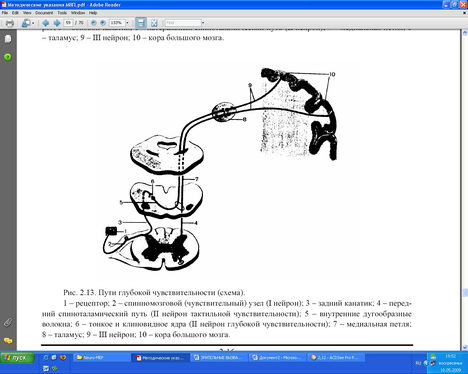 1 – рецептор; 2 – спинномозговой (чувствительный) узел (I нейрон); 3 – задний канатик; 4 – передний спиноталамический путь (II нейрон тактильной чувствительности); 5 – внутренние дугообразные волокна; 6 – тонкое и клиновидное ядра (II нейрон глубокой чувствительности); 7 – медиальная петля; 8 – таламус; 9 – III нейрон; 10 – кора большого мозга.