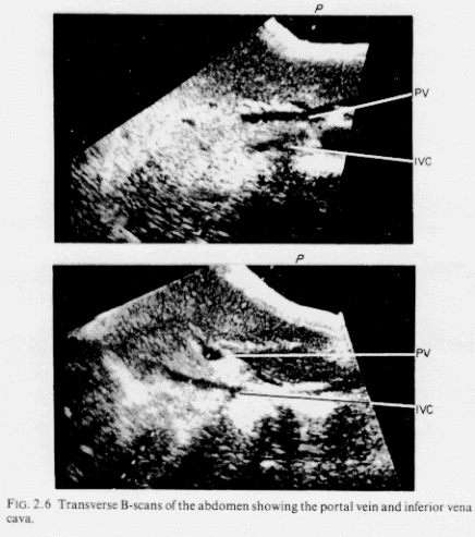 A major disadvantage of the simple continuous-wave flowmeter is its inability to discriminate in range. The continuous-wave transmission creates an ultrasonic beam which occupies the complete diffraction pattern of the transducer. Any target moving within this beam will contribute to the final Doppler output. During clinical use of CW devices this sometimes makes it impossible to isolate flow in adjoining blood vessels. For example, in the B-scan tomograms of the abdomen shown in Fig. 2.6, a continuous-wave flowmeter transducer situated at P and interrogating flow in the portal vein (PV) would also receive interfering signals from the more distant inferior vena cava (IVC). Range selectivity can sometimes be a vital requirement in Doppler investigations and so this section describes the various methods of coding the transmitted burst and processing the received echo so that the range of the moving targets can be determined. During the description the effects on the basic Doppler equation of imposing restraints on the axial selectivity of the flowmeter will be investigated.