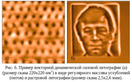 С использованием динамической силовой литографии (наночеканки) модификация поверхности происходит за счет формирования углублений на поверхности образца колеблющимся зондом (рис. 6), при этом используется прерывисто-контактный метод сканирования. Такой метод нанолитографии свободен от торсионных искажений и позволяет производить визуализацию сформированного рисунка без серьезного воздействия на поверхность подложки или резиста. Кратковременное «укалывание» поверхности также защищает зонд от быстрого разрушения.