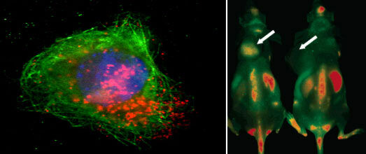 Рисунок 2 - Слева: многоцветное конфокальное флуоресцентное изображение распределения квантовых точек на фоне микроструктуры клеточного цитоскелета и ядра в клетках линии THP-1 фагоцитов человека. Нанокристаллы остаются фотостабильными в клетках в течение как минимум 24 часов и не вызывают нарушений структуры и функции клеток. Справа: накопление нанокристаллов, «сшитых» с пептидом RGD в опухолевой области (стрелка). Правее — контроль, введены нанокристаллы без пептида (CdTe нанокристаллы, 705 нм)