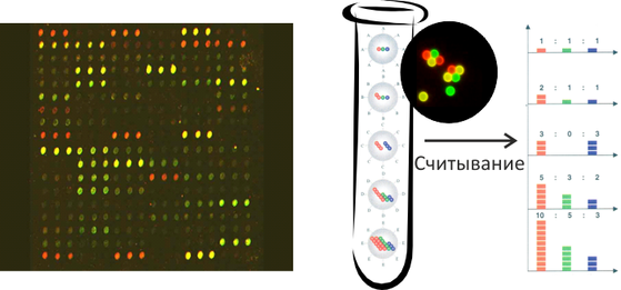 Рисунок 3 - Принцип спектрального кодирования. Слева: «обычный» плоский микрочип. Справа: «жидкий микрочип», каждый элемент которого содержит заданные количества КТ определенных цветов. При n уровнях интенсивности флуоресценции и m цветах теоретическое количество кодируемых вариантов равно nm−1. Так, для 5–6 цветов и 6 уровней интенсивности это будет 10000–40000 вариантов.