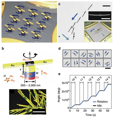 Инженерам удалось решить две ключевые проблемы: автоматическую сборку наномоторов и управление их движением. Сборку производили с помощью новой техники «электрического пинцета», которая позволяет помещать наночастицы в субстрате по произвольным траекториям с точностью 150 нм, контролируя их угол и скорость в пульсирующем токе (см. иллюстрацию c).