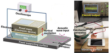В настоящее время существует много различных наногенераторов, работающих на основе пьезоэффекта. По мнению авторов преимущества их образца для практических целей заключаются в том, что можно легко изменять его размеры и интегрировать в различные электронные устройства. Используемая полимерная пленка похожа на губку. Схема эксперимента, проведенного в работе, представлена на рисунке. С двух сторон на полимерную пленку крепятся электроды (медная фольга). Пленка с электродами устанавливается на поверхность, по которой и будут распространяться вибрации. Сверху на пленку с электродами помещается мобильный телефон, который в данном эксперименте играет роль массы, усиливающей колебания пленки. Показано, что напряжение за счет вибраций на поверхности может достигать в такой схеме 3,7 В (для сравнения напряжение питания USB-порта 5 В). Этого хватило, чтобы включить телефон с установленной аккумуляторной батареей (видео прилагается в дополнительных материалах к статье). Следует отметить, что пока необходимая частота генератора колебаний довольно большая (около 40 Гц), чтобы применять подобное устройство для зарядки телефона от вибраций, например, в автомобиле.