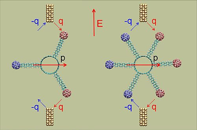 В однородном электростатическом поле Е, ориентированном вдоль вертикального направления,используется периодическая зарядка и разрядка лопасти мотора с помощью тунеллирования электронов издвух нейтральных металлических электродов. Каждый фуллереновый переключатель меняет знак заряда спомощью двух электронов с положительного (q) на отрицательный (-q) посредством туннеля междунейтральным электродом и фуллереном. Чтобы повернуть лопасть мотора электрод теряет два электрона (врезультате чего на нем меняется заряд) и лопасть совершает половину цикла вращения в электрическомполе Е. Другая половина цикла вращения происходит аналогично (только электрод получает два электрона).Таким образом происходит непрерывное вращение трех (шести) лопастей с фуллеренами. Молекулярныйдвигатель ведет свою диполь P, которая находится в средней ортогонали по направлению к электрическомуполю Е, генерирую постоянный крутящий момент вращения.