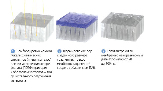 Другой метод получения нанопористых материалов - бомбардировка ионами инертных газов. Получаемые данной технологией фильтры называют трековыми мембранами. Размеры пор в таких мембранах – 20 -100 нм. Материал мембраны бомбардируется ускоренными ионами инертных газов с большим атомарным весом. Следы от этих ионов назвались треками, далее происходит травление для формирования пор с требуемой геометрической характеристикой. На рисунке 2 представлена схема получения трековых мембран.