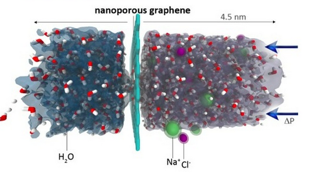 Прибегнув к классическому моделированию динамики молекул, ученые MIT – Девид Кохен-Танги (David Cohen-Tanugi) и Джеффри Гроссман (Jeffrey C. Grossman) – изучили водопроницаемость нанопористого графена с разным диаметром (0,015-0,62 нм2) и химическим составом пор. Эксперименты показали, что нанопоры в графене могут проделываться разными способами, включая просверливание пучком ионов гелия и химическое травление. В ходе моделирования ученые укрепляли нанопоры пассивированием (химический процесс создания защитной окисной плёнки на поверхности материала), или экранированием, каждого атома углерода по краю поры атомами водорода либо гидроксильной группы. После они сравнили два химических состава (в сочетании с разными размерами пор) графеновых фильтров, пропустив через них морскую воду с соленостью 72 г/л, что в два раза превышает среднюю соленость морской воды (около 35 г/л). Данное моделирование позволило определить промежуточный диапазон диаметров нанопор, обеспечивающих прохождение воды и удерживание соли.