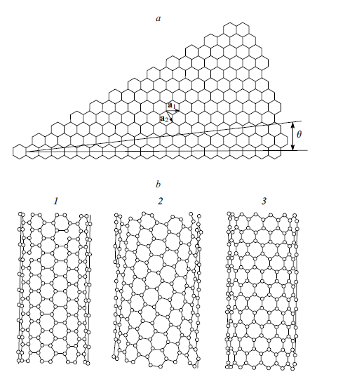 некоторые из представлений и методов углеродных нанотрубок (УНТ) ниже. Идеальные не-УНТ, по причине, описанной выше, так же, как и УНТ имеют форму цилиндра, стенки которого состоят из гексагонов, с атомами углерода в вершинах. Наглядно процедуру формирования нанотрубок можно представить как свёртывание «ленты» из атомов углерода, вырезанной из монослоя графита (графитовой сетки). «Разрезание» слоя графита можно осуществлять вдоль линий, перпендикулярных или проходящим по связям С-С, или под углом θ к ним, так называемым хиральным углом (рисунок 2, а). Тогда при сворачивании получаемых «лент» и сшивании их краёв возникают 2 основных типа НТ – нехиральные и хиральные. Нехиральные НТ делят на два типа: зигзагообразные и зубчатые (рисунок 2, в).