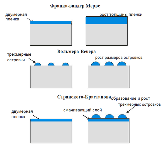 Экспериментально установлено, что при осаждении атомов на подложку из газовой фазы наблюдаются три типа начальной стадии роста: механизм Франка–Ван дер Мерве (слоевый рост), Фольмера–Вебера (островковый рост) и Странского–Крастанова (промежуточный тип).