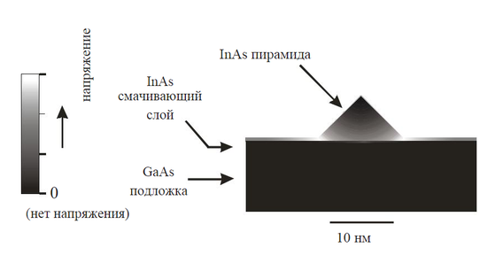 Постоянная решетки InAs больше, чем у GaAs. При осаждении InAs на подложку GaAs сначала формируется слой InAs. Этот слой из-за различия решеток — напряженный (ячейки как бы стремятся выгнуться). По мере увеличения толщины слоя упругая энергия растет, связи между атомами слоя начинают рваться, некоторые атомы частично освобождаются. Происходит перераспределение материала и образуются трехмерные островки. Когда образуется островок, решетка InAs частично распрямляется и получается выигрыш в энергии. Образование трехмерных островков начинается после осаждения 1,6–1,7 слоев InAs.