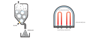 Вместо стержней-затравок, FBR использует гранулы очищенного кремния (рисунок 3). Гранулы проходят через камеру, в которую поступает силан. Поток газа как бы «разжижает» поток гранул, заставляя их течь подобно жидкости. Проходя через реактор, гранулы растут за счёт осаждаемого кремния.