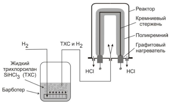 Очищенный ТХС является основным сырьем для получения чистого поликремния. Для этого чаще всего применяется процесс и реактор фирмы Сименс (Siemens). Сименс процесс - это процесс химического осаждения поликремния из газовой фазы (chemical vapore deposition, CVD). Газообразный ТХС и водород подаются в реактор, в котором размещены стержни-затравки из кремния высокой чистоты (рисунок 2). Прутки нагреты до температуры 1200-1300° С, поэтому именно на их поверхности ТХС реагирует с водородом, разлагается и высаживается в виде поликремния : 2SiHCl3 (газ) + 2Н2 (газ) →2Si (тв) + 6HCl (газ)