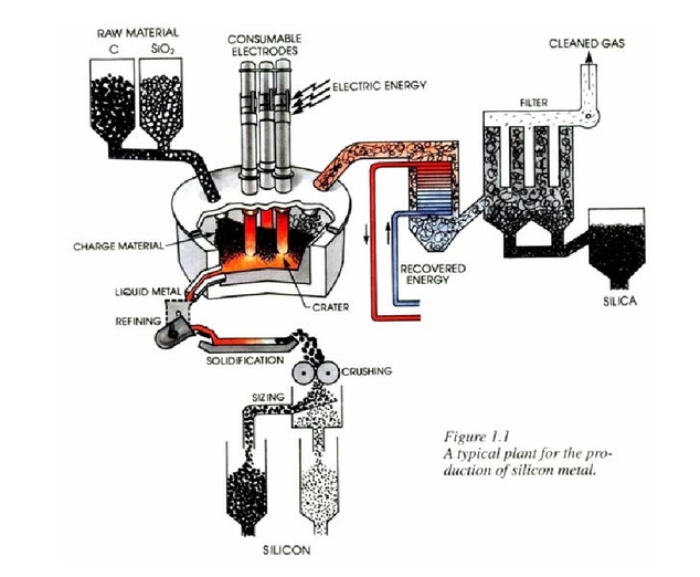 Производственная цепочка получения кремния начинается с диоксида кремния (кремнезема) SiO2. Кремнезем широко распространен в природе в виде песка, кварца и глины. Восстановление кремния из SiO2 ведется карботермическим процессом за счет взаимодействия диоксида кремния с углеродом при температуре около 1800°С. SiO2 (тв) + 2C (тв) = Si (тв) + 2CO (газ) Исходное сырье вносится в состав шихты в виде кварцита – кварцевого песка, содержащего не менее 98% SiO2. Углерод получается из древесного угля, кокса, сажи, древесной щепы. Процесс ведется в дуговых электропечах (рисунок 1) огромной мощности - от 8 до 25 МВА. Подача энергии осуществляется с помощью одного, двух или трех графитовых электродов, при этом сила тока