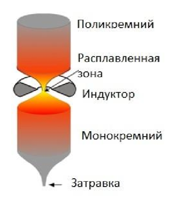 Метод бестигельной зонной плавки основан на проплавлении в исходном слитке кремния узкой зоны и перемещении ее вдоль слитка. Поскольку при этом исключен контакт расплава кремния с тиглем, это позволяет получать более тонкую очистку, чем методом Чохральского. Расплавленная зона формируется кольцевым нагревателем, например, индукционной катушкой, которая перемещается вдоль оси слитка (рисунок 5).