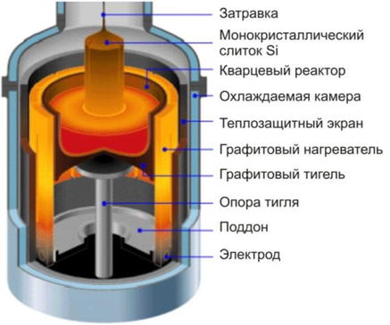 Вращая кристалл-затравку и одновременно перемещая ее вверх, можно вытянуть из расплава монокристаллический слиток кремния цилиндрической формы. В настоящее время освоена технология получения слитков диаметром до 300 мм, готовится переход на слитки диаметром 450 мм. Температура и скорость вытягивания регулируются так, чтобы в начале процесса формировалась тонкая шейка диаметром 4…8 мм и длиной 200…300 мм, предотвращающая образование дислокаций из-за температурного шока в момент касании затравки и расплава. Скорость вытягивания на этом этапе составляет 2…4 мм/мин. Далее формируется участок с большим диаметром (плечики), а затем идет равномерное вытягивание слитка заданного диаметра со скоростью около 1 мм/мин. Для уменьшения загрязнений расплава в установке для выращивания кристаллов методом Чохральского используют реактор из плавленого кварца, размещаемый в графитовом тигле (рисунок 4).